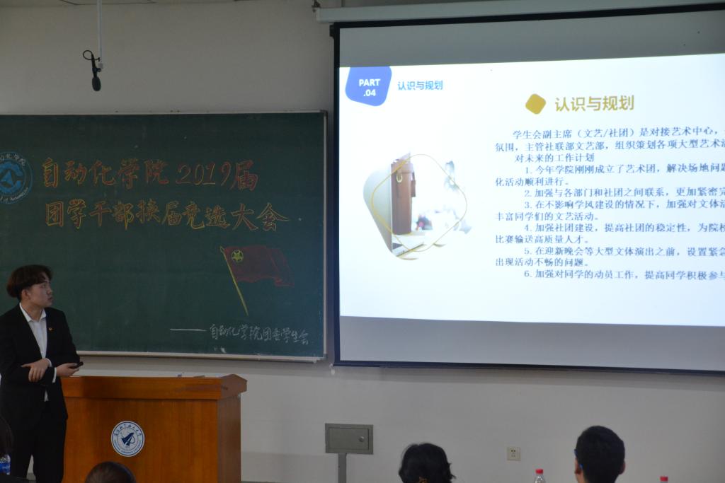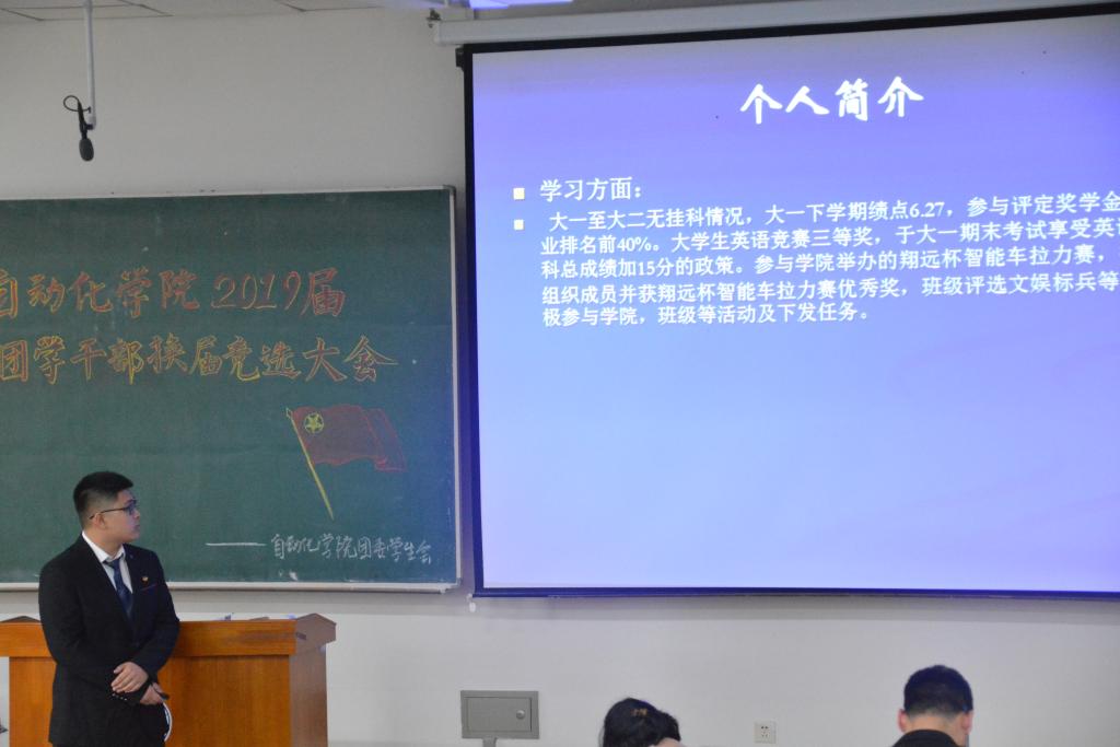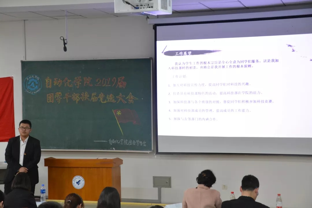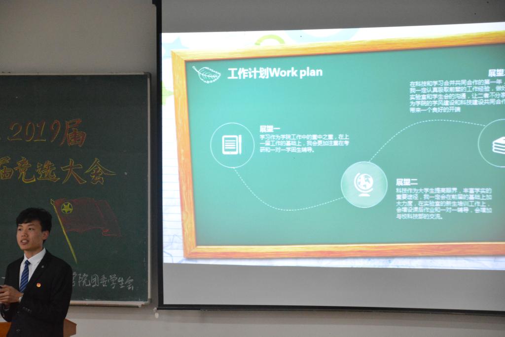 竞选大会在学生团委副书记李惠的主持下正式召开。本次参加竞选的一共24位同学,竞选者们结合PPT进行了时长3分钟的演讲。他们的演讲风格都有着鲜明的个人特色,但都结合自己的优缺点阐明了对团学工作的设想以及对未来工作的展望。随后每位部长对竞选者提问,即问即答。
