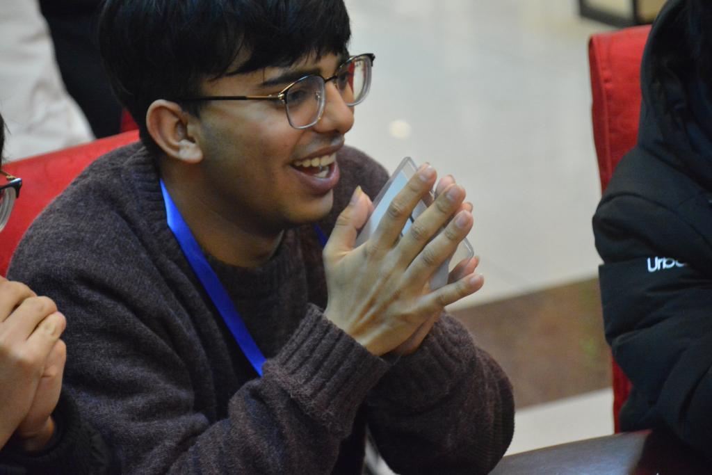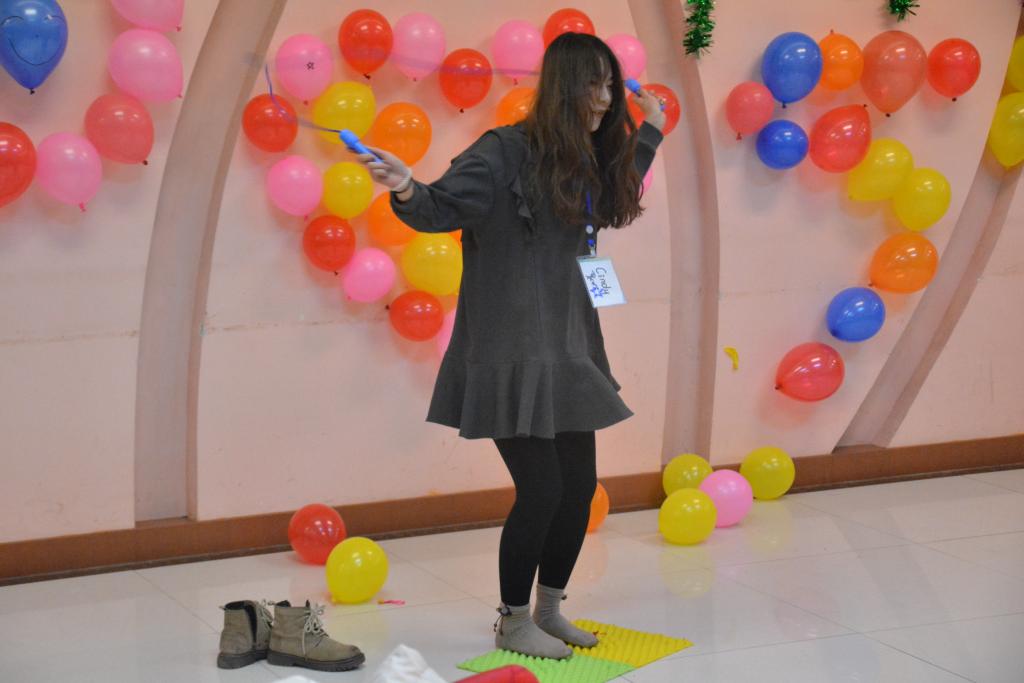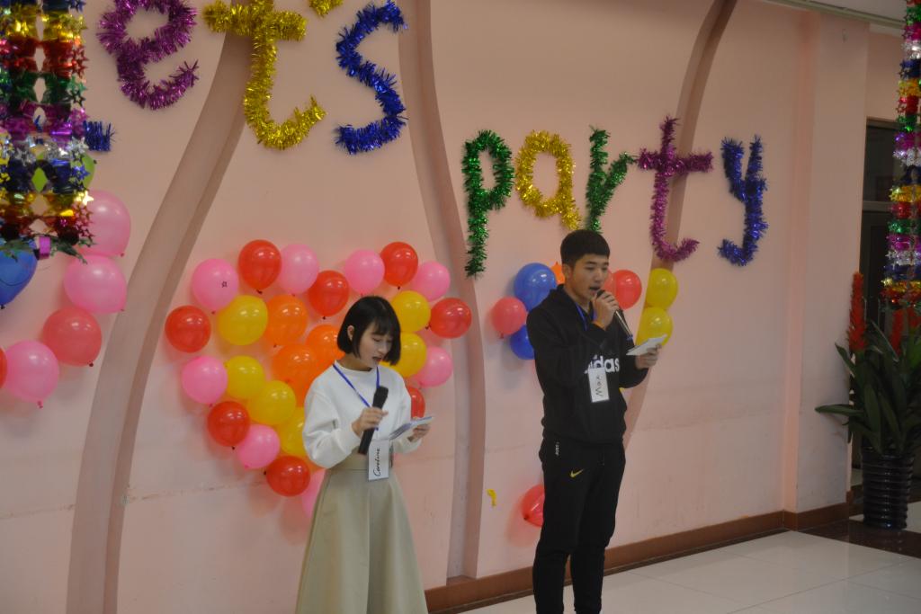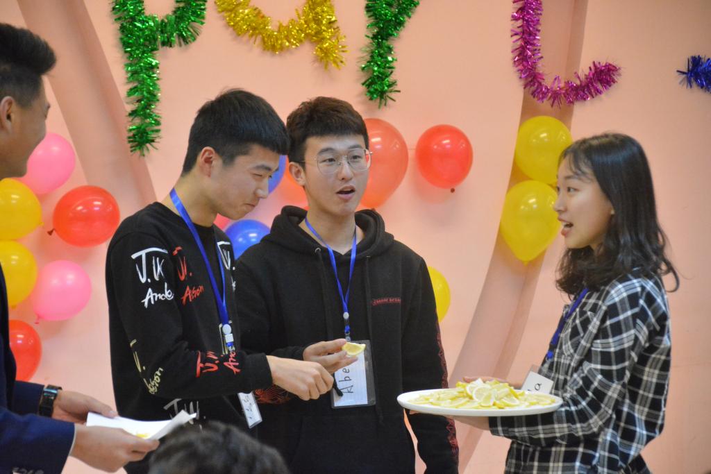 联谊会进入到游戏环节,同学们进行了神枪手、英文介绍家乡、英文版你来比划我来猜等游戏。游戏输者接了惩罚,如表演才艺、微笑柠檬、学说中英文绕口令、指压板跳绳等;胜者获得了相应的奖品。游戏使得现场气氛十分火热。