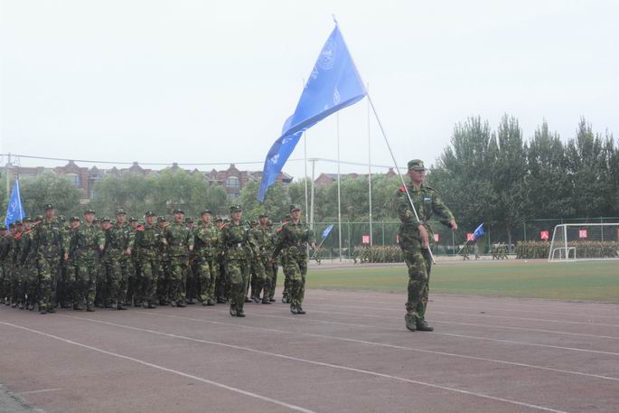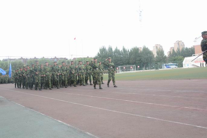 在庄严的国歌声中,威武的国旗护卫队员迈着矫健的步伐,护送着五星红旗走向升旗台,在雄壮的国歌声中国旗冉冉升起,全体师生面向国旗肃立,新生军训结营仪式正式开始。