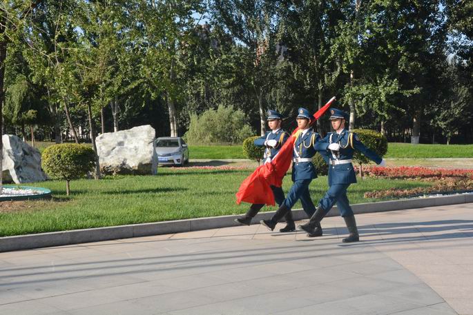 随着“出国旗”口令的下达,由学校尖兵队队员组成的国旗队,迈着铿锵有力的步伐,走向升旗台。升旗仪式正式拉开了帷幕。升旗手、护旗手在歌声中,把国旗护送至升旗台。