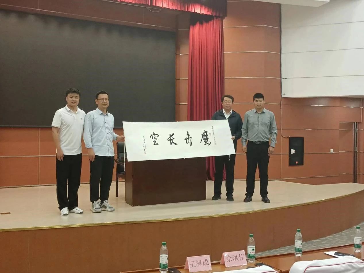 会后,两位校友共同为学院赠送书法作品《鹰击长空》,党委副书记高得伦与辅导员周永乐老师代表学院接受了珍贵的校友礼物。